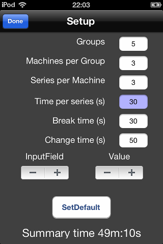 Setup screen: navigate with the InputField, change values within the blue current field. Groups is the number of muscle groups (e.g. arms, legs, …), each muscle group is trained with a number of machines, each machine has some series. The time settings are in seconds. The "Summary time" is the complete time including workout, resting, machine changes. You should take at least the same time for resting as well as the time for workout. After setup, go back with "Done" to the normal screen.